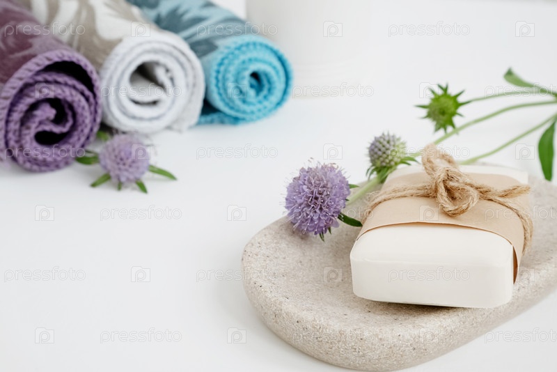 Органическое мыло, завернутое в крафт-бумагу и перевязанное веревкой, лежит на подносе, разноцветные рулоны полотенец на заднем плане