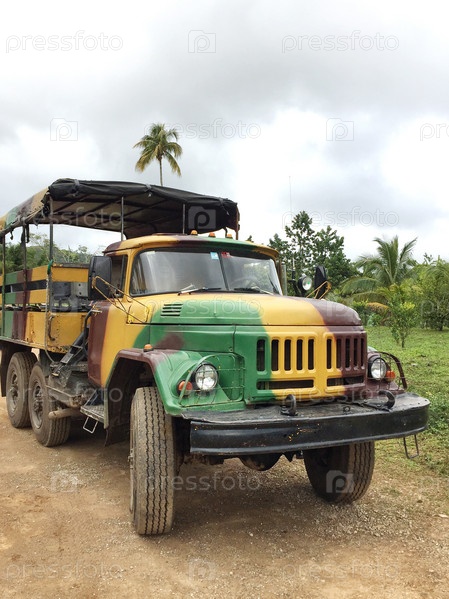 Старый советский грузовик ЗИЛ с тентом в защитной краске