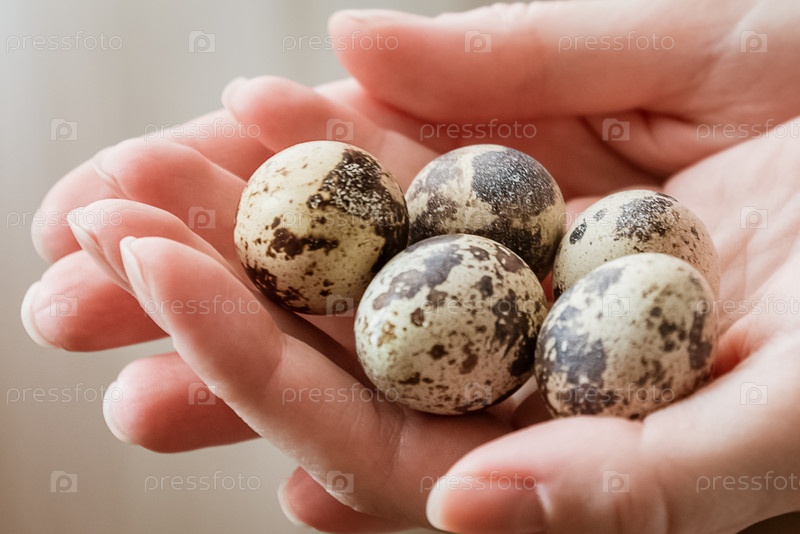 Женщина держит в руках маленькие пятнистые перепелиные яйца