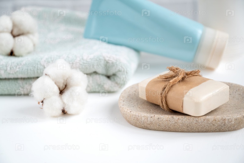 Ванная комната с новым куском мыла на подносе, свежим чистым полотенцем и тюбиком косметики, украшенным пушистыми ватными шариками