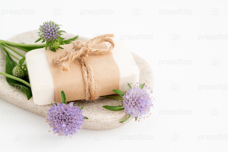 Органическое натуральное мыло на подносе с ароматическими растениями