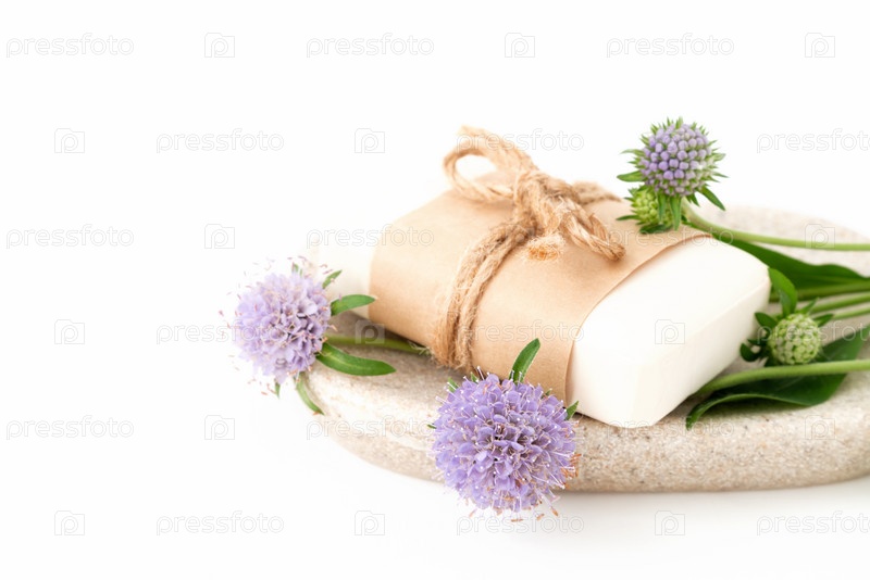 Органическое натуральное мыло на подносе с ароматическими растениями