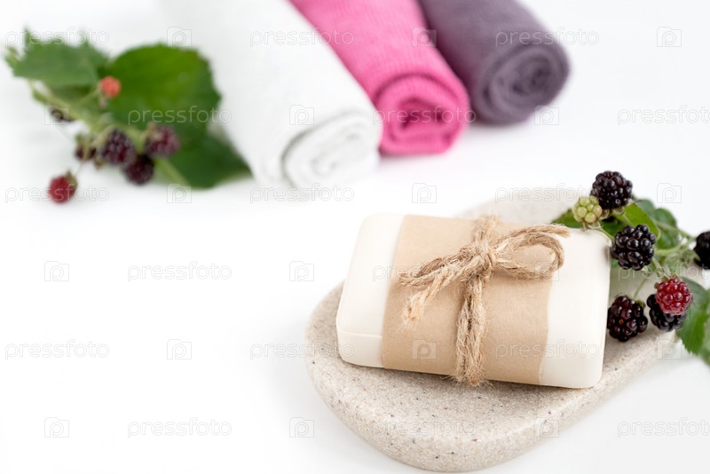 Кусок органического мыла, завернутый в крафт-бумагу на подносе со свежей веткой ежевики и красочными свернутыми полотенцами на столе