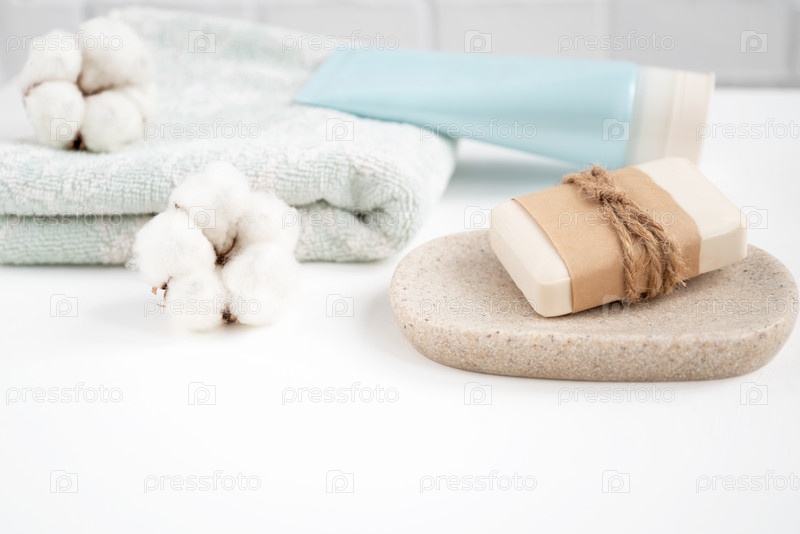 Ванная комната с новым куском мыла на подносе и свежим чистым полотенцем, украшенным пушистыми ватными шариками