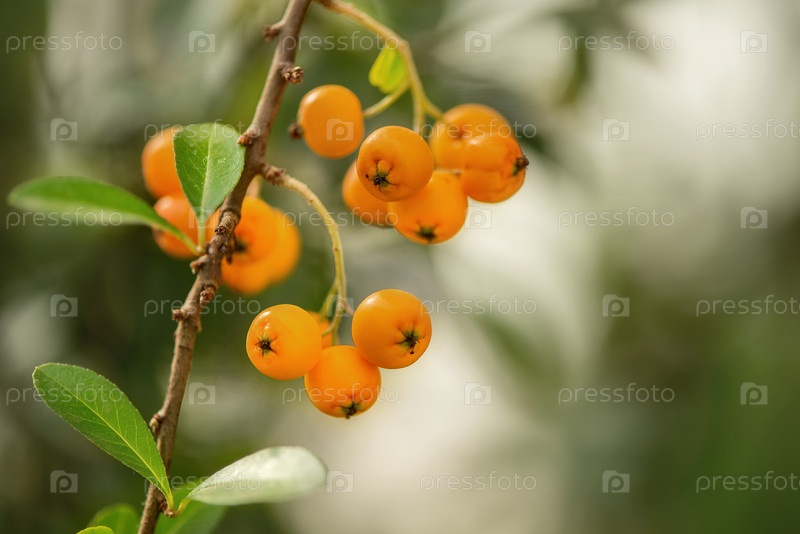 Куча спелых желтых ягод рябины на размытом фоне зеленых листьев
