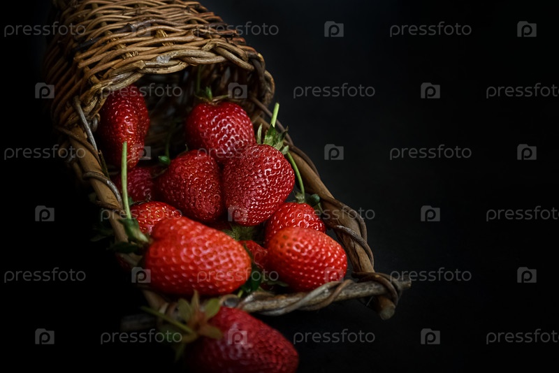 Плетеная корзина лежит на темной поверхности, полной красных спелых клубник, фон летней еды
