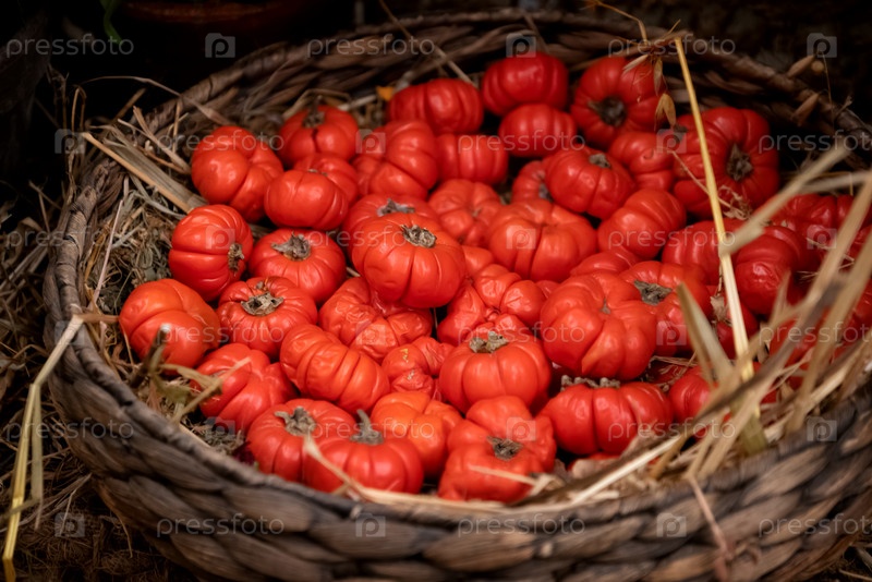 Плетеная корзина, наполненная спелыми красными помидорами