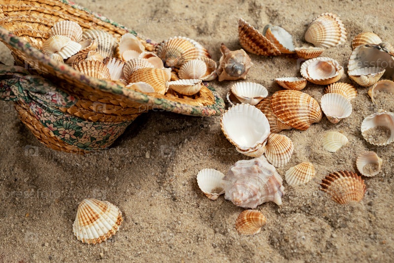 Соломенная шляпа, наполненная ракушками, собранными на берегу, выбрасывается на песок на пляже