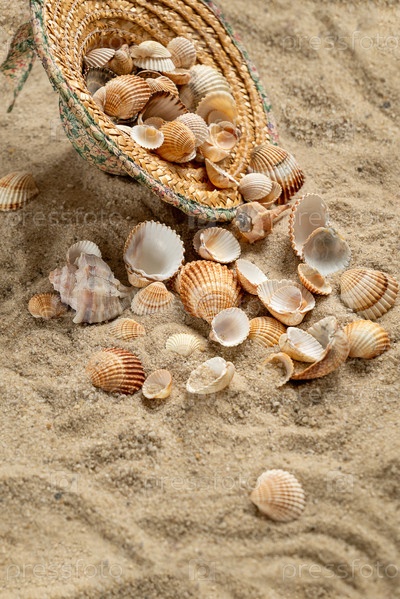 Соломенная шляпа, наполненная ракушками, собранными на берегу, выбрасывается на песок на пляже