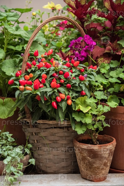 Красный перец халапеньо растет в декоративной плетеной корзине в домашнем саду