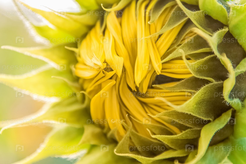 Желтые лепестки нераскрытого соцветия подсолнуха крупным планом