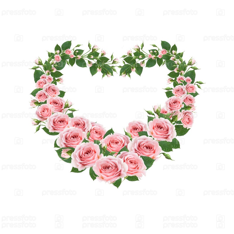 Приветственная рамка сердца, сотканная из ветвей цветущей розовой розы на белом фоне