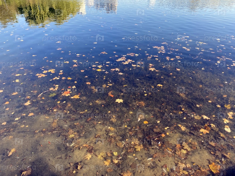 Желтые кленовые листья на воде в сухой солнечный осенний день