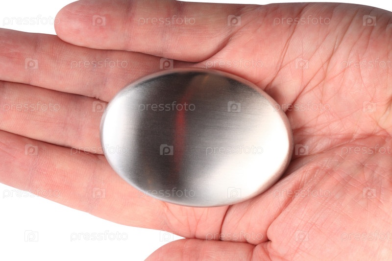 Рука с мылом из нержавеющей стали на белом фоне