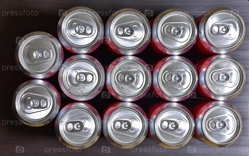 Алюминиевые банки, вид сверху, пивные банки закрыты, много пивных алюминиевых банок