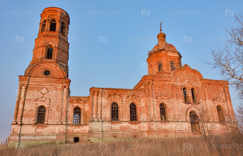 Древняя заброшенная и разрушенная церковь, рушащийся храм из красного кирпича, заброшенный храм из красного кирпича, освещенный закатным солнцем, заброшенная церковь на закате