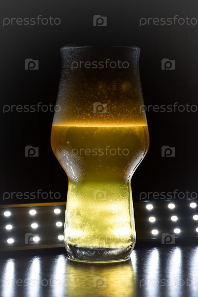 Выделенный стакан с пивом крупным планом в темноте на столе, кудрявый стакан с желтой жидкостью крупным планом на столе