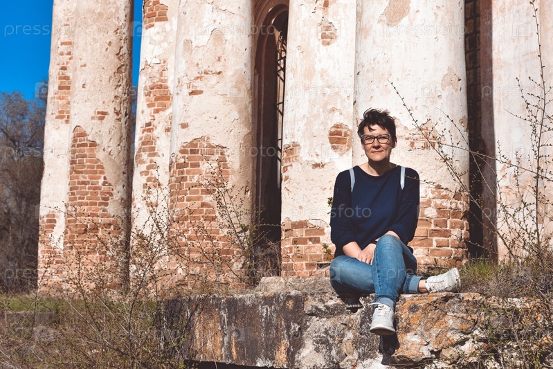 Девушка в очках сидит на фоне заброшенного здания, заброшенной церкви