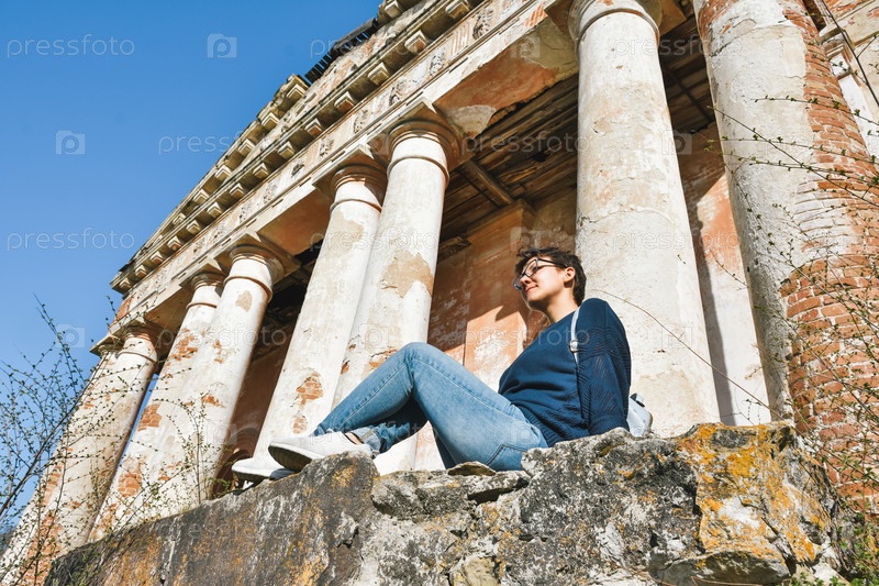 Девушка в очках сидит на фоне заброшенного здания, заброшенной церкви
