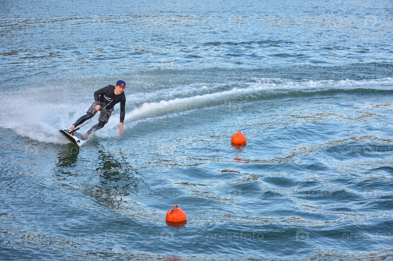 Участник Motosurf вступает в поворот при скорости, образуя много распылений. реактивный серфинг на воде, мужчина катается на реактивной доске для сёрфинга. серфер в движении, летний спорт
