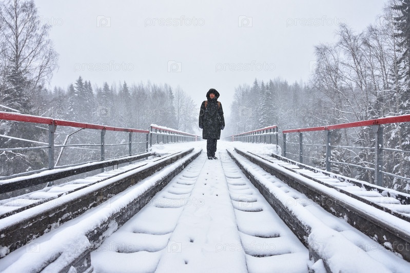 Девушка стоит на железной дороге в снегу