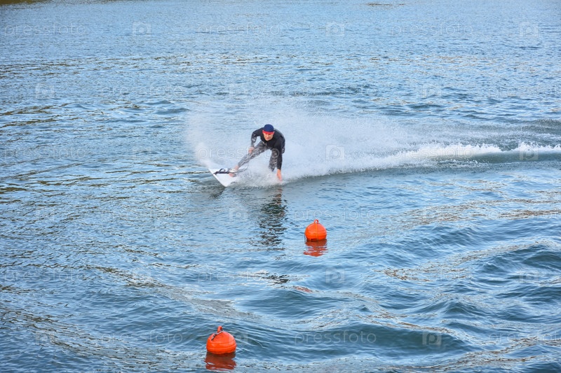 Участник Motosurf вступает в поворот при скорости, образуя много распылений. реактивный серфинг на воде, мужчина катается на реактивной доске для сёрфинга. серфер в движении, летний спорт