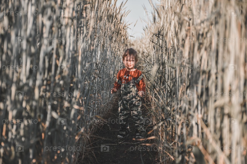 Портрет маленького мальчика, стоящего среди колосьев пшеничного поля. ребенок посреди серого пшеничного поля, колосья пшеницы выше ребенка. Солнечный летний портрет