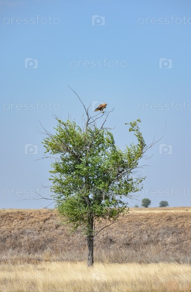 Ястреб сидит на дереве в поле