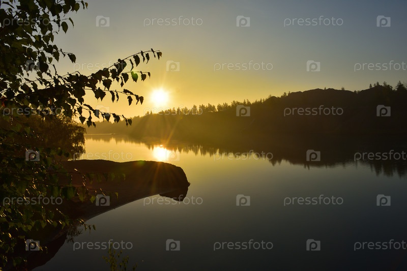 Желтый рассвет над озером в затопленном карьере