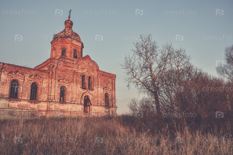 Древняя заброшенная и разрушенная церковь, рушащийся храм из красного кирпича, заброшенный храм из красного кирпича, освещенный закатным солнцем, заброшенная церковь на закате