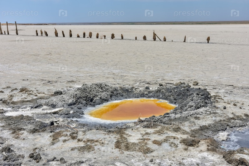 Кристаллизованная соль и природная минеральная грязь в высохшем соленом озере. Здесь люди принимают грязевые ванны из-за пользы серы. Естественный фон. Высохшее соленое озеро. озеро с лечебной грязью