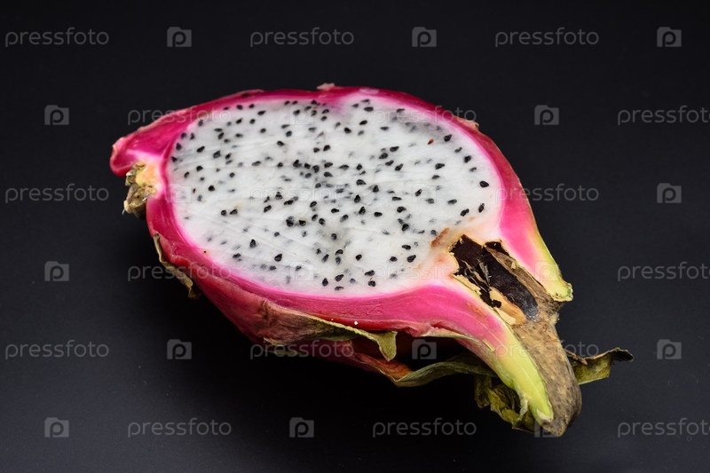 Нарезать питахайю на черном фоне крупным планом, нарезать драконий фрукт