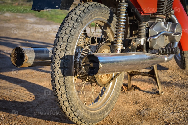 Выхлопная труба и заднее колесо редкого мотоцикла, красный велосипед