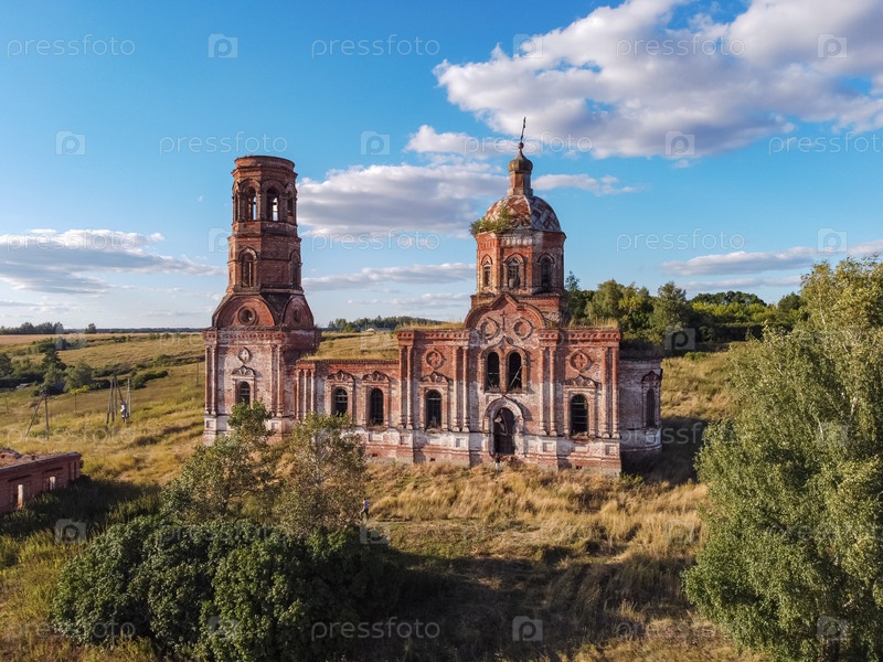 Полет над заброшенной церковью, древняя заброшенная и разрушенная церковь, полуразрушенный храм из красного кирпича