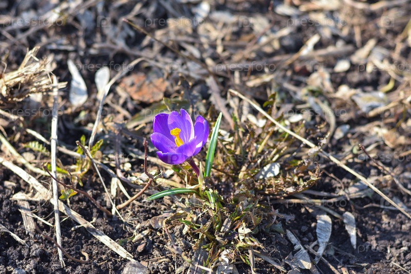 Одинокий весенний фиолетовый крокус крупным планом