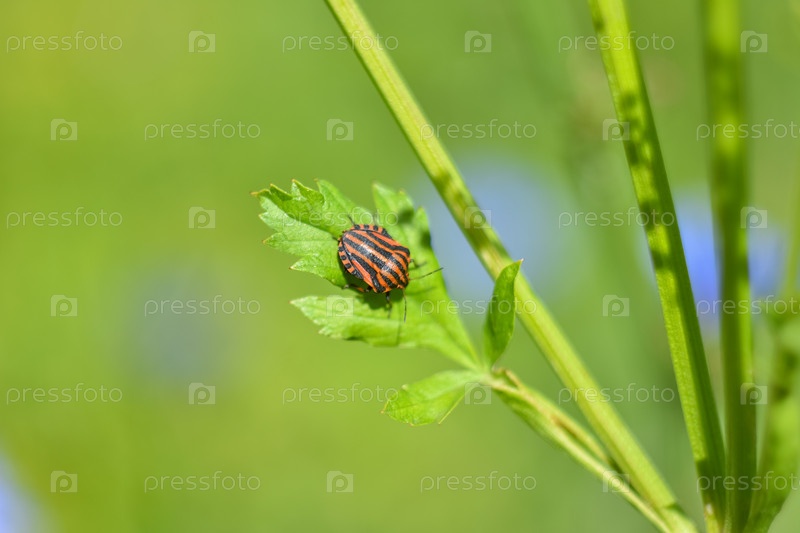 Макро полосатый жук на зеленом растении