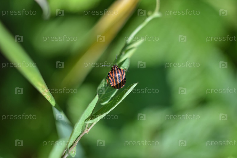 Макро полосатый жук на зеленом растении