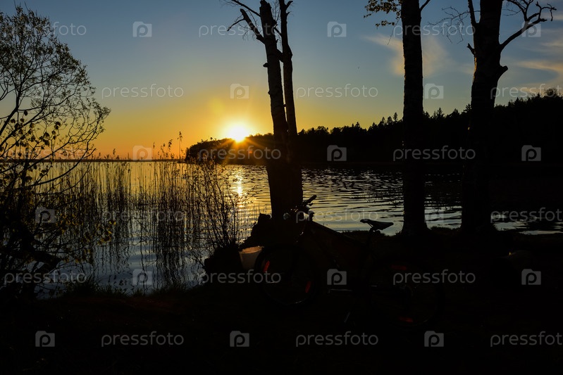 Силуэты деревьев на фоне заката на озере