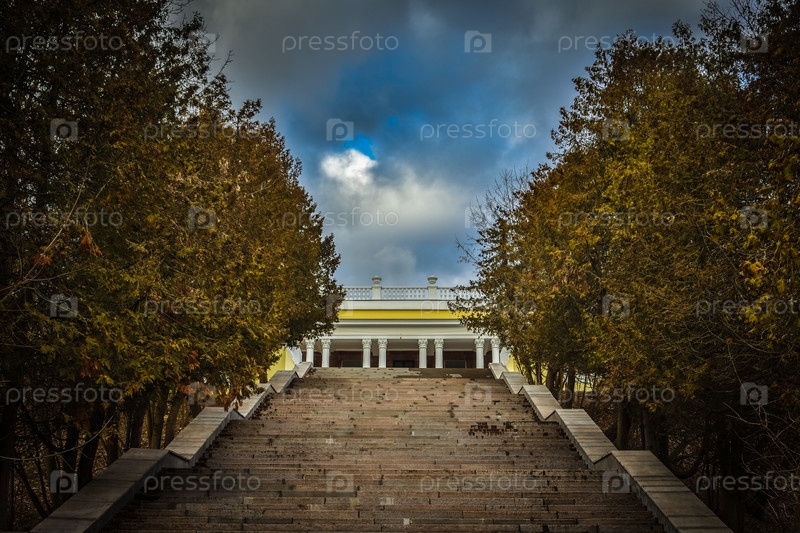 Лестница к зданию между деревьями
