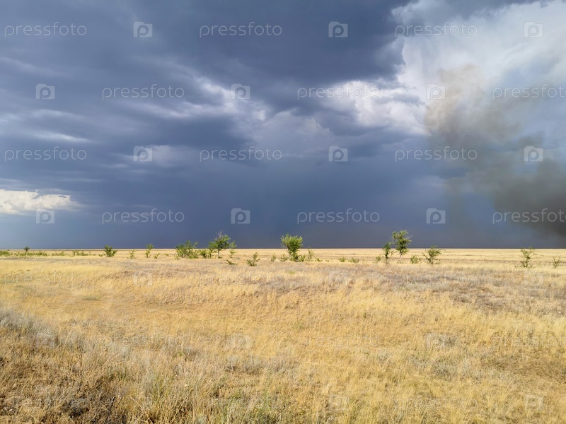 Грозовое небо в поле, гроза в степи, пожар в степи