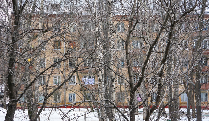 Жилой дом сквозь зимние деревья
