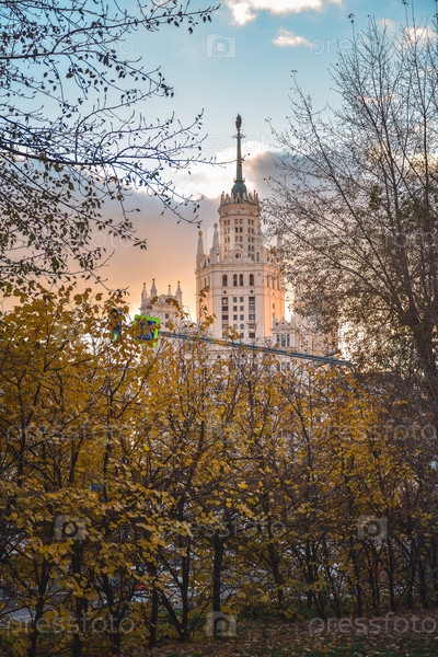 Сталинская высотки сквозь осенние деревья на закате