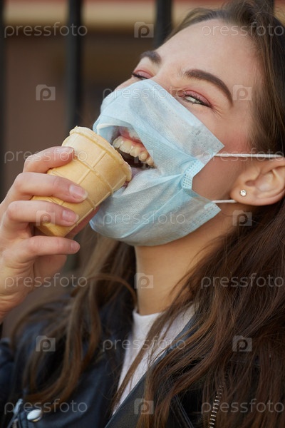 Девушка ест в маске