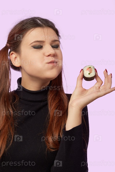 Женщина ест суши