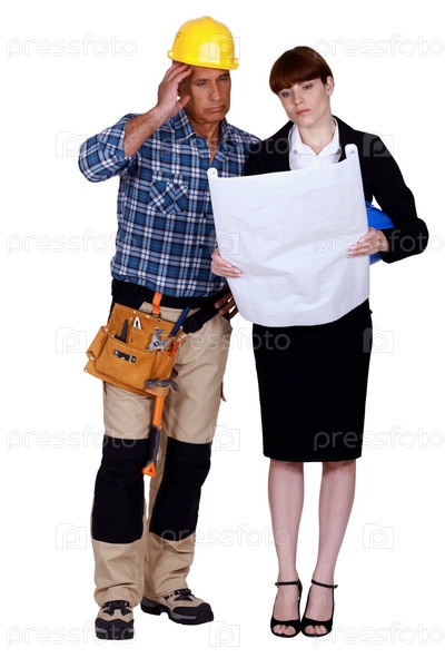 Инженер и строитель смотрят на план