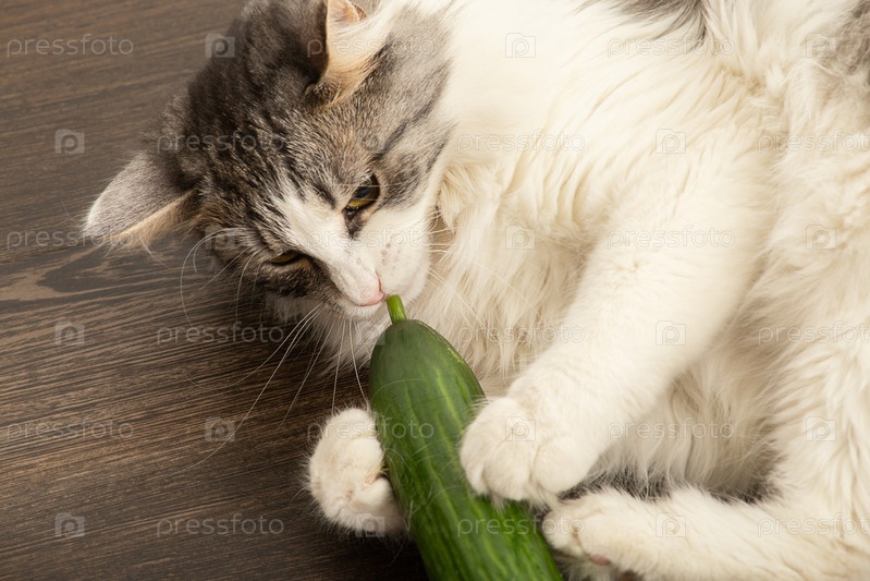 Кошка ест огурец