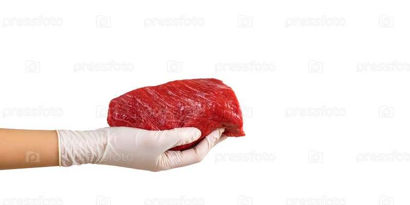 Кусок свежего сырого говяжьего мяса в руке в перчатке, изолированный на белом фоне. Концепция гигиенического приготовления пищи, безопасных покупок или доставки на дом. Баннер, шаблон, место для текста