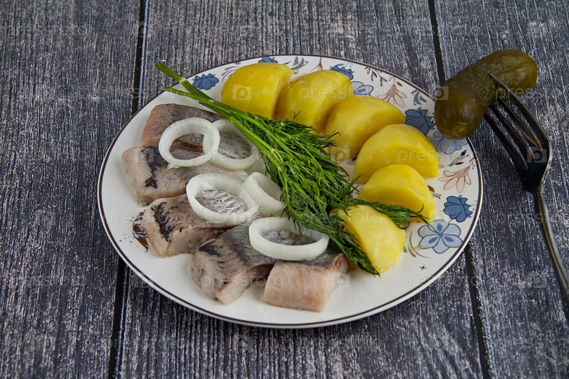 Закуска в тарелке: селедка, картошка, лук, укроп