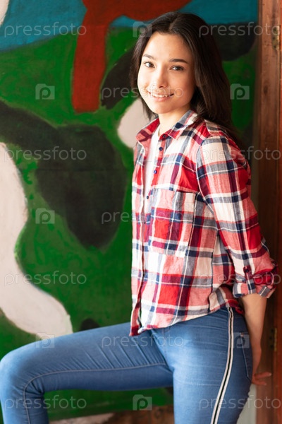 Молодая красивая женщина позирует в красной клетчатой рубашке в студии