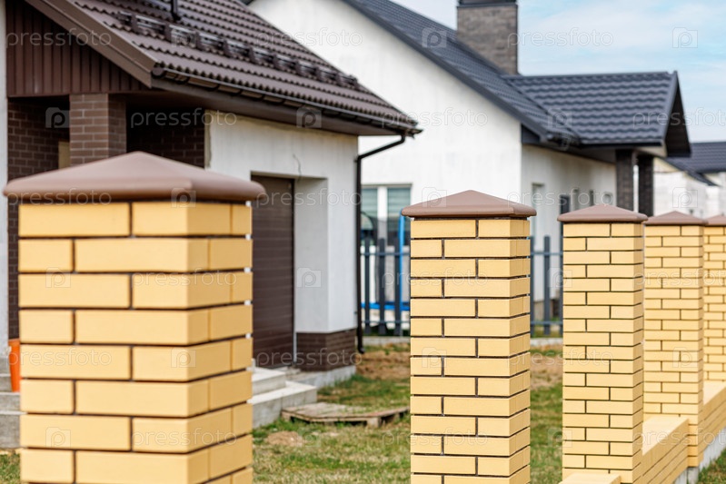 Фрагмент современного забора, облицованного декоративным кирпичом в старинном стиле